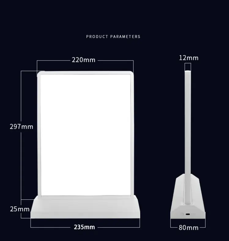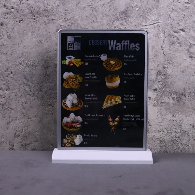 Le porte-menu de table lumineux est un dispositif LED intégré dans un support de menu traditionnel. Ce produit combine à la fois la technologie moderne de l’éclairage LED avec la fonctionnalité classique des porte-menus. Il est conçu pour mettre en valeur les menus, les promotions spéciales ou même les cartes de boissons de manière élégante et lumineuse, assurant ainsi que vos offres soient visibles même dans des espaces faiblement éclairés.
